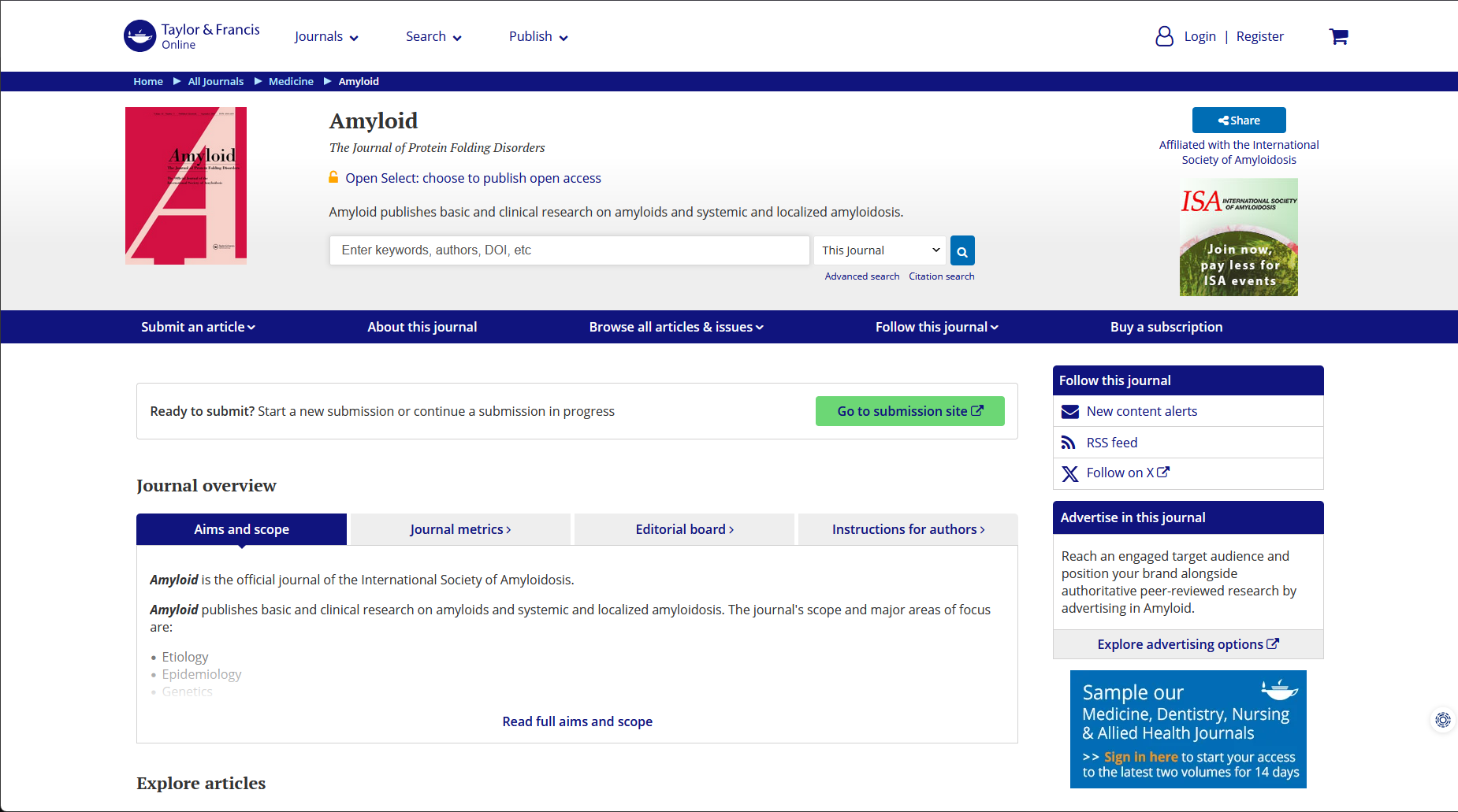 An individual subscription to Amyloid, an official journal of ISA, is a benefit of ISA membership. If you currently have access to Amyloid, you can login to your account at http://www.tandfonline.com/.